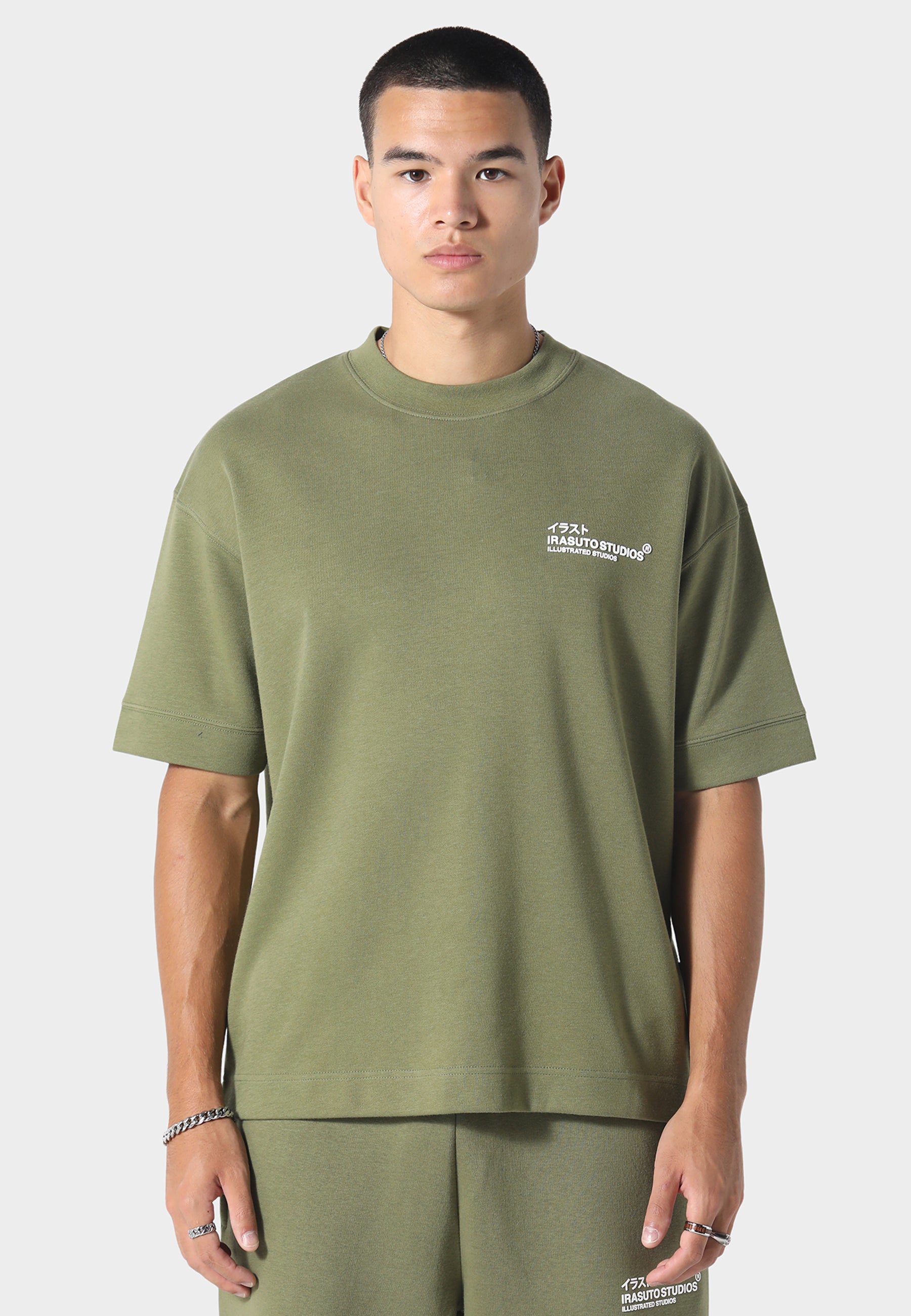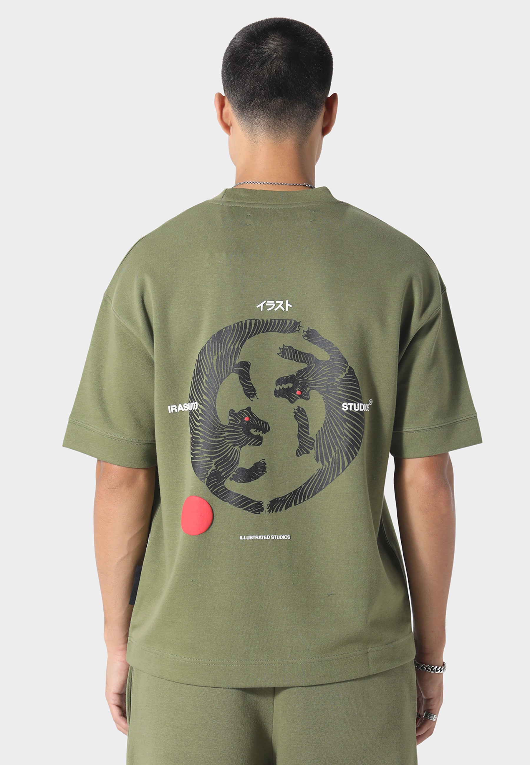The Claw T-Shirt in Khaki is crafted from heavyweight cotton jersey and cut in a relaxed silhouette. The front features a screen-printed Irasuto Studios® logo on the chest, while the back is detailed with high-density printed twin tiger graphics. A raised puff print red sun adds a final tactile element to the composition.