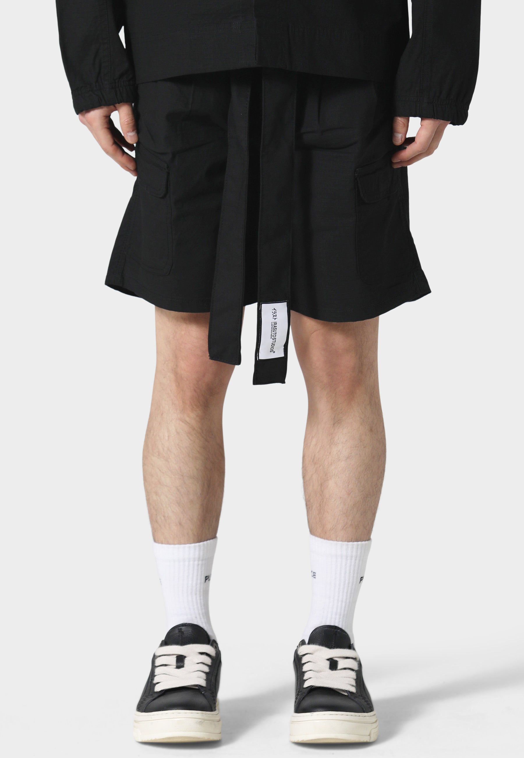 he Rip Stop Cargo Shorts merge durable ripstop fabric with utilitarian design. Featuring multiple cargo pockets, a zip fly with button closure, and a branded tie-fastened belt, each detail serves both function and street-ready style. A tonal logo on the pocket adds a subtle signature, while the relaxed oversized fit delivers ease and presence.