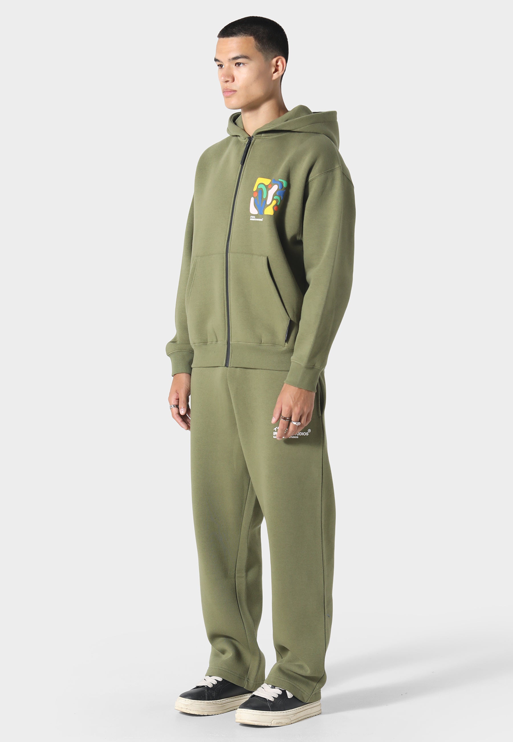 A bold clash of colour and composition, the Shikaku Form Hoodie merges abstract shape-work with functionality. Crafted in heavyweight brushed-back fleece, this khaki zip-up features a multi-layered puff print on the front chest and back – a visual translation of balance and movement.