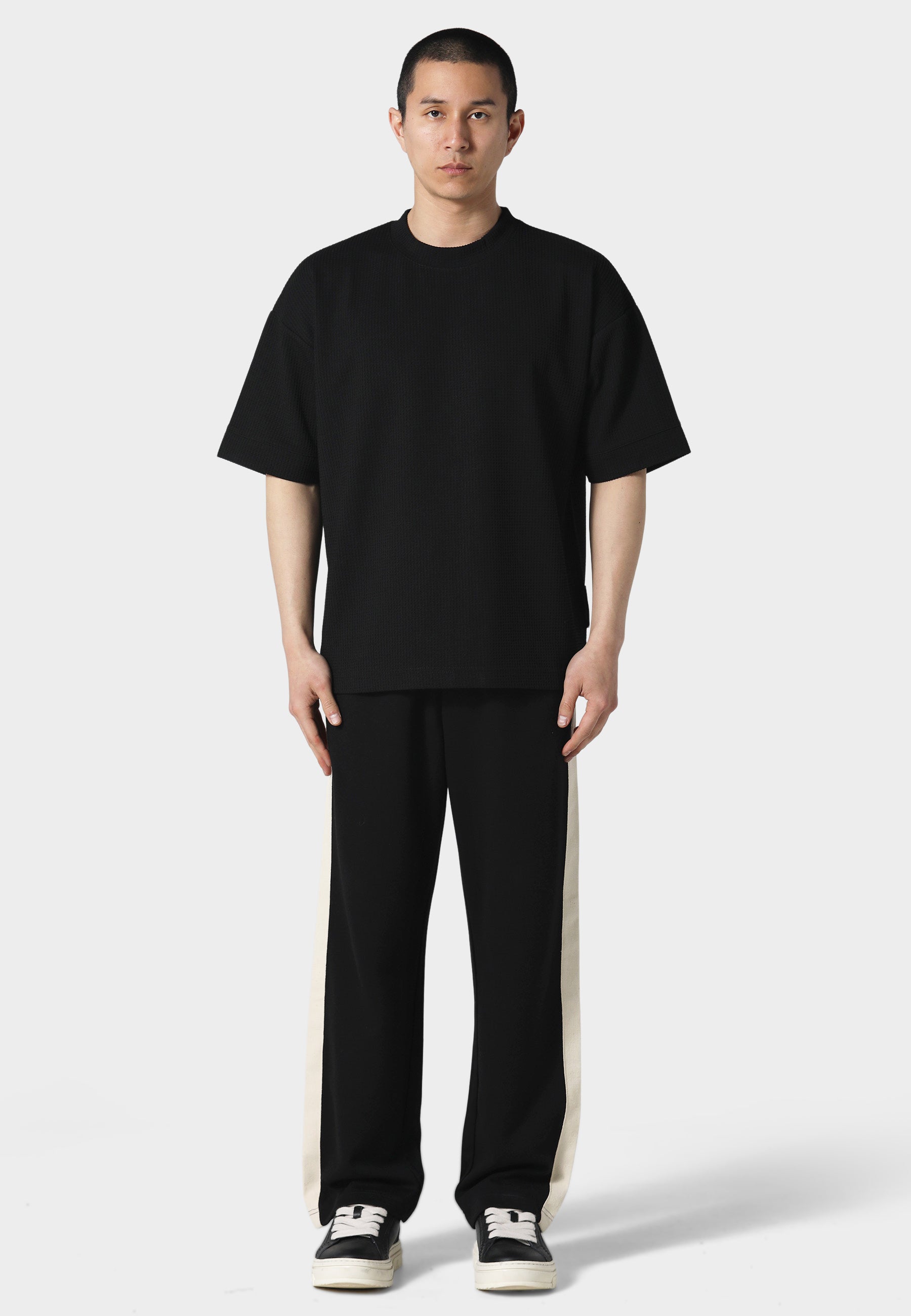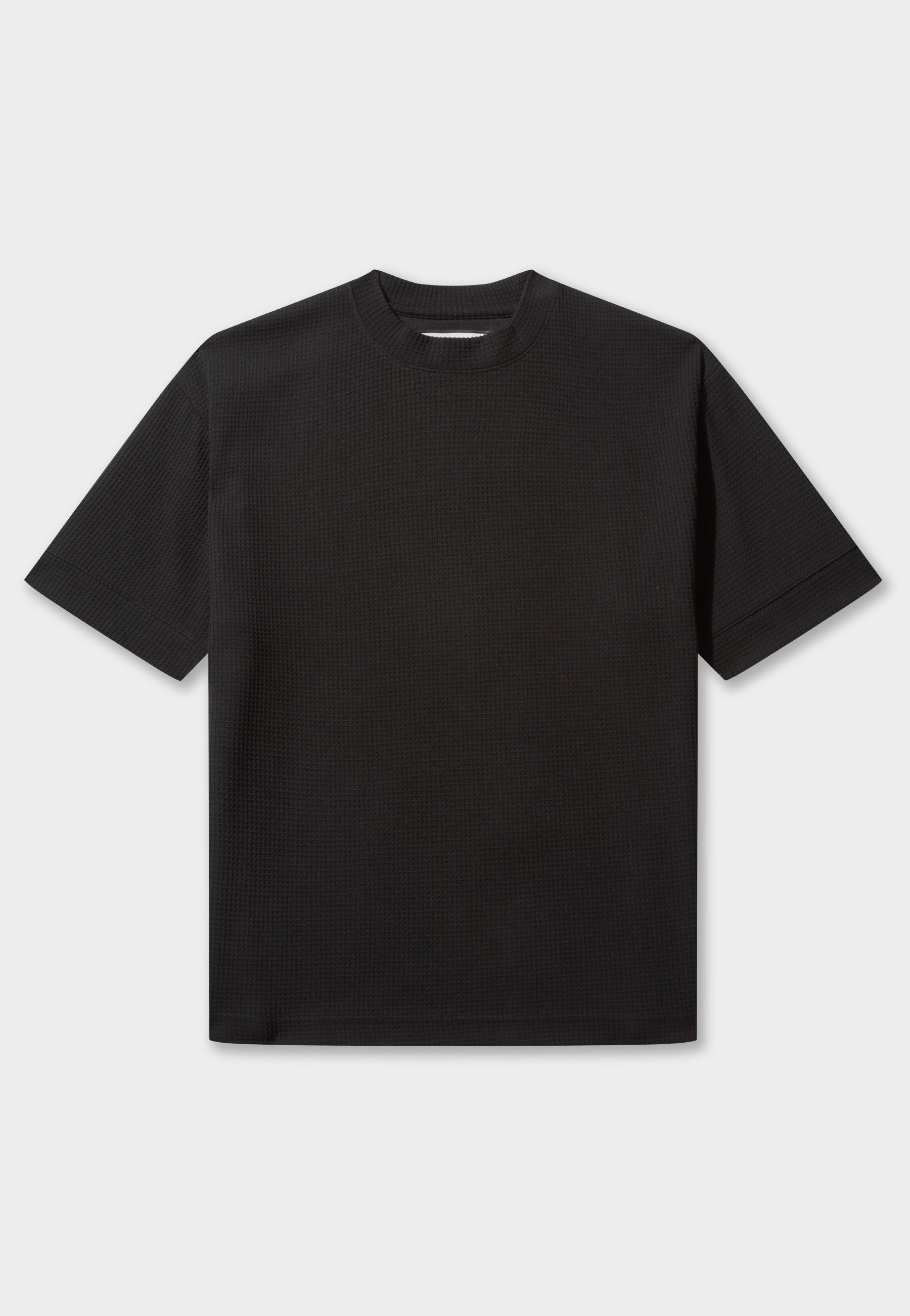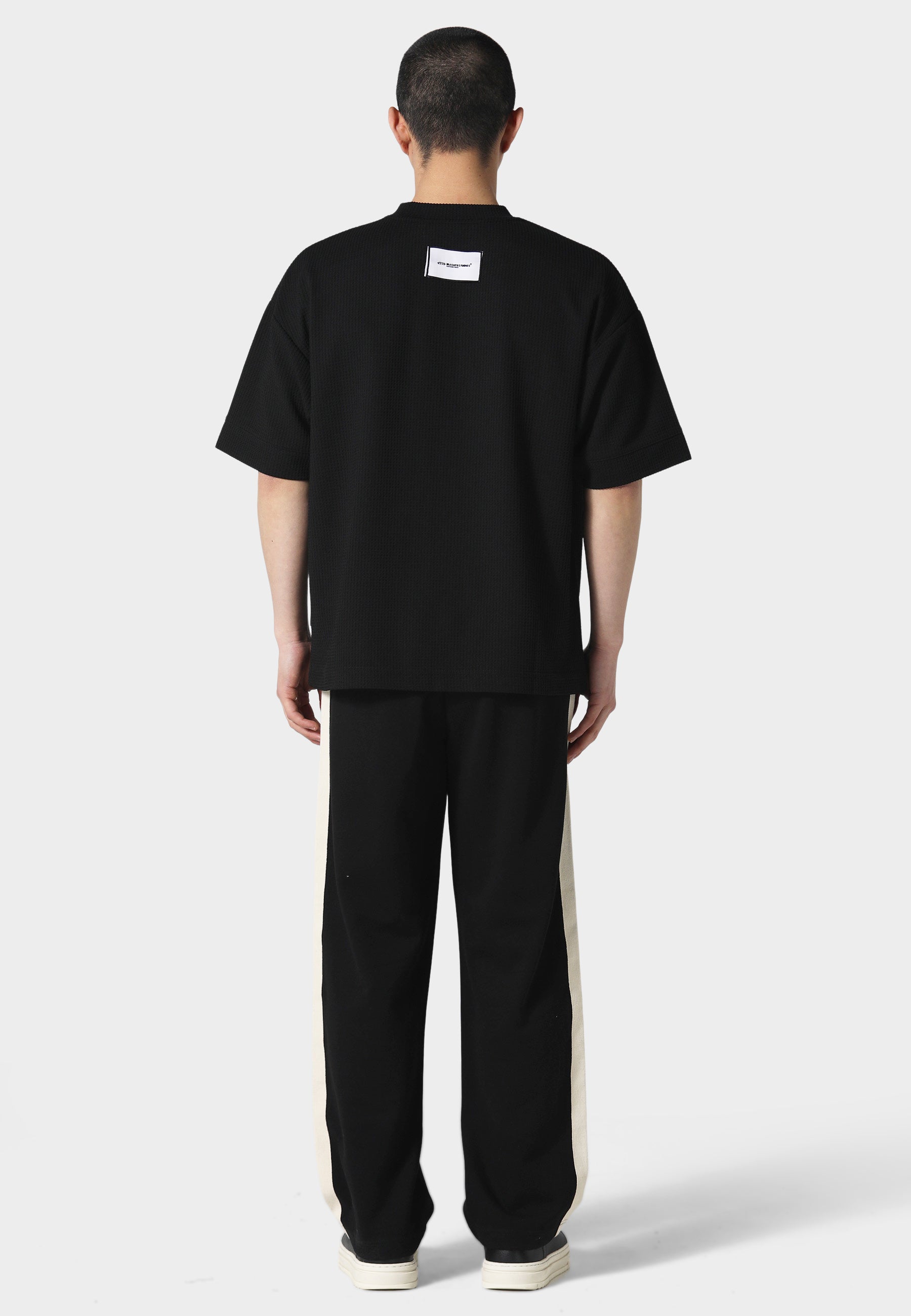 Minimal in design, bold in presence — the Waffle Black T-Shirt blends comfort with quiet statement. Cut from textured waffle-knit fabric, it features an oversized, boxy fit with a classic crewneck and short sleeves for a relaxed silhouette. Finished with back appliqué woven patch label adding subtle dimension, letting the craftsmanship speak louder than words. A modern essential where texture, fit, and detail define the attitude.
