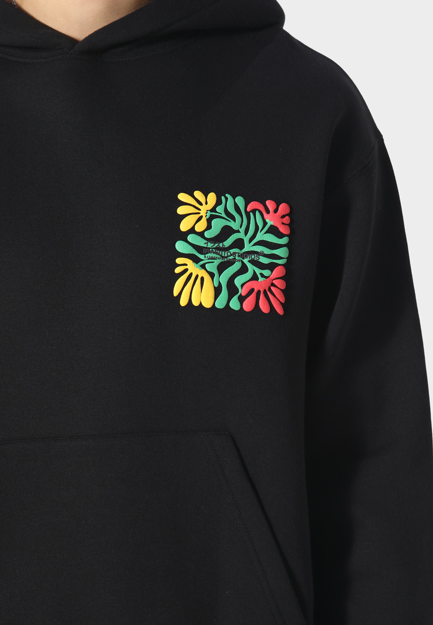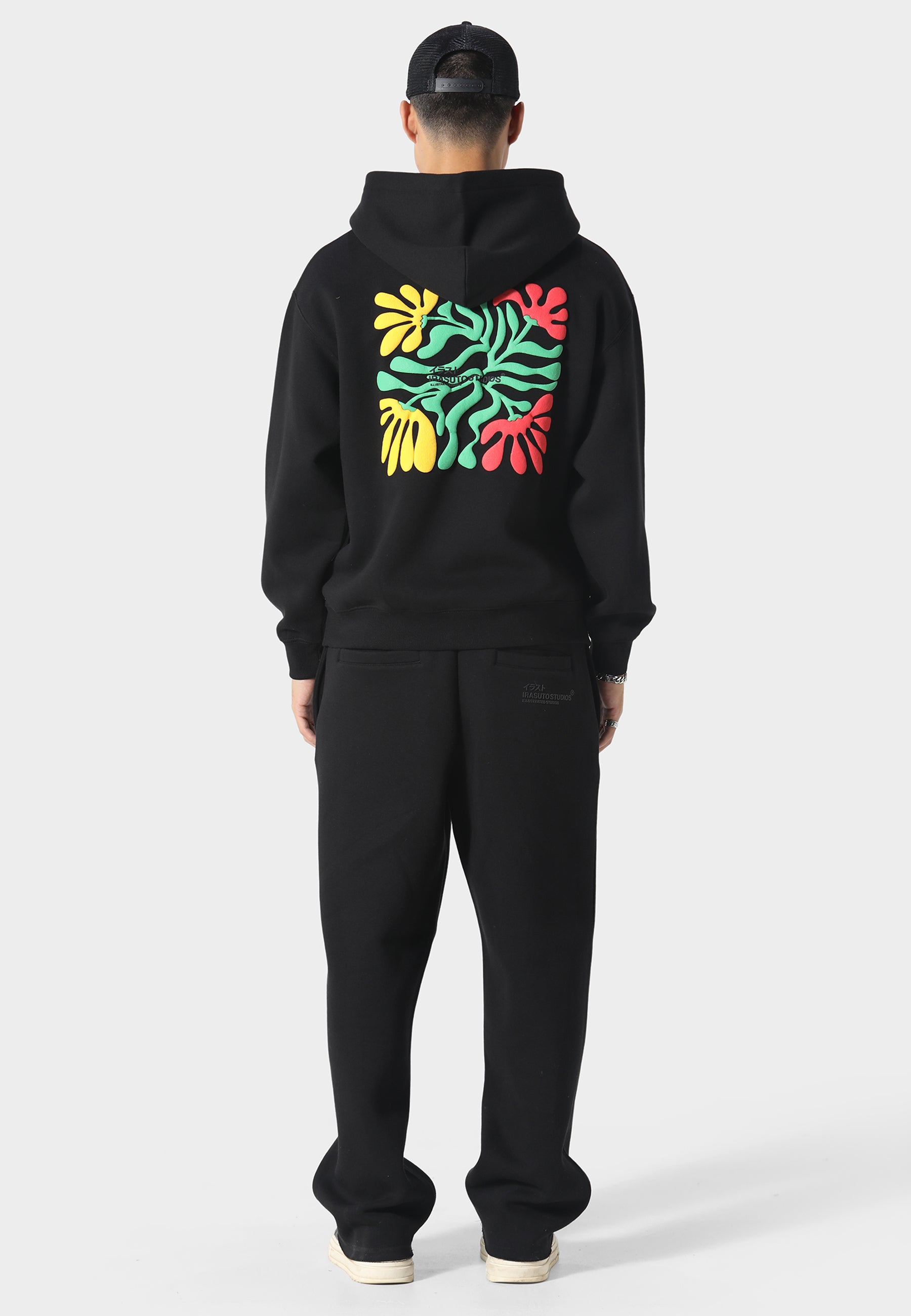 A bold fusion of colour and form, the Zen Forest Hoodie features abstract botanical shapes in vibrant yellow, red, and green. The oversized back artwork and front chest graphic are crafted in tactile high-density puff print. Cut from heavyweight brushback fabric for a structured feel and premium warmth.